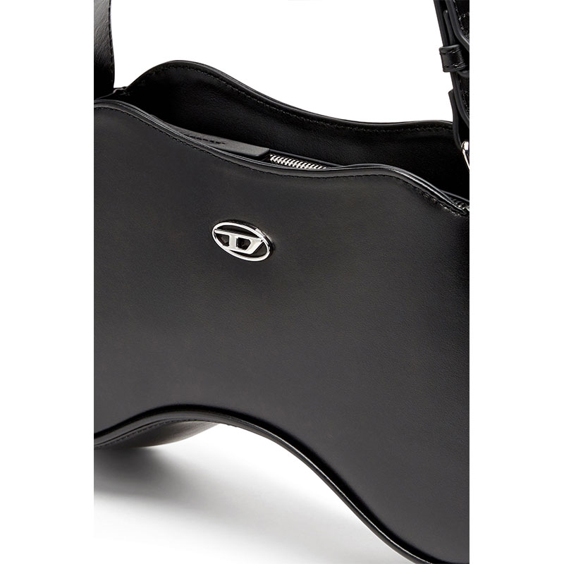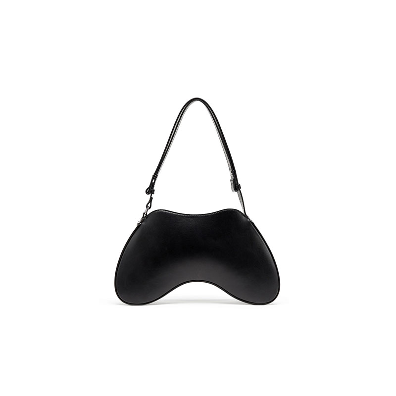 Sleek and playful, this women's shoulder bag is characterised by a sinuous shape inspired by gaming controllers. It's crafted from smooth leather with a semi-gloss finish, embellished by shiny Oval D hardware and fastened with a zipper at the top. The shoulder strap is adjustable to customise the drop.