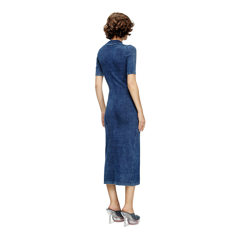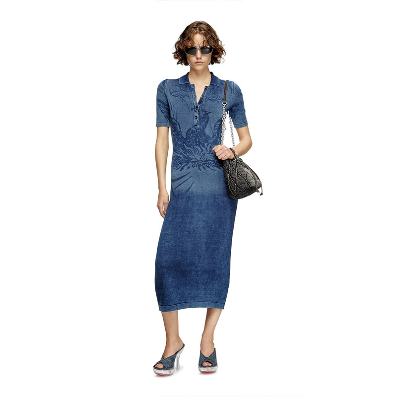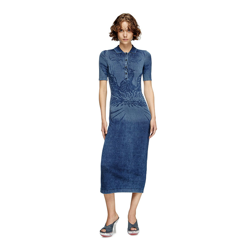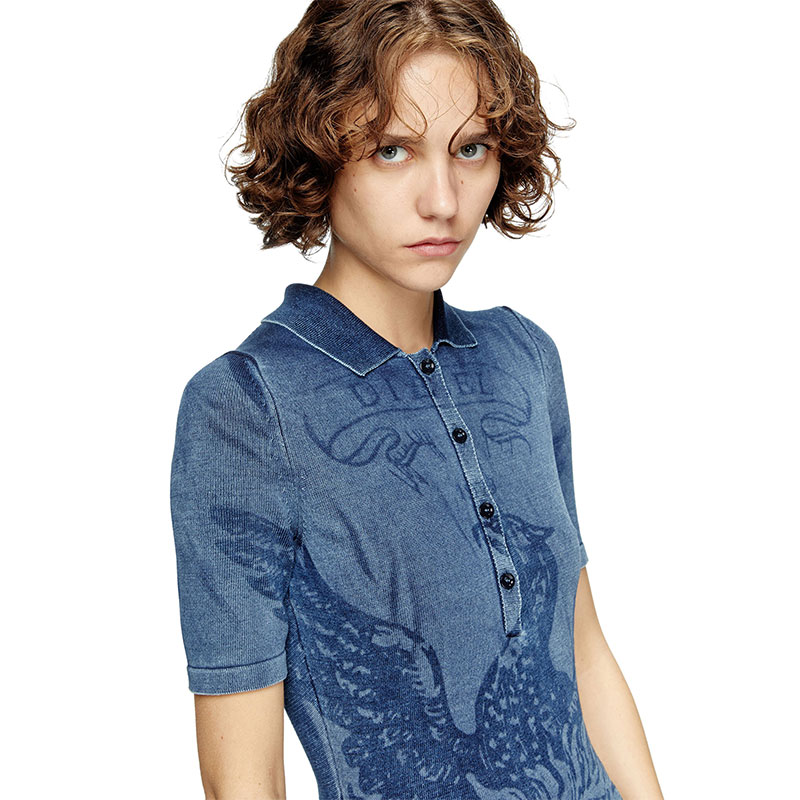 Women’s midi polo dress with three-quarter sleeves and a close-fitting silhouette. Inspired by Diesel's DNA fabric – denim, this blue knitted style is made from organic cotton dyed in real indigo and has a stonewashed finish. A bold laser-etched artwork depicting the Phoenix logo decorates the front.