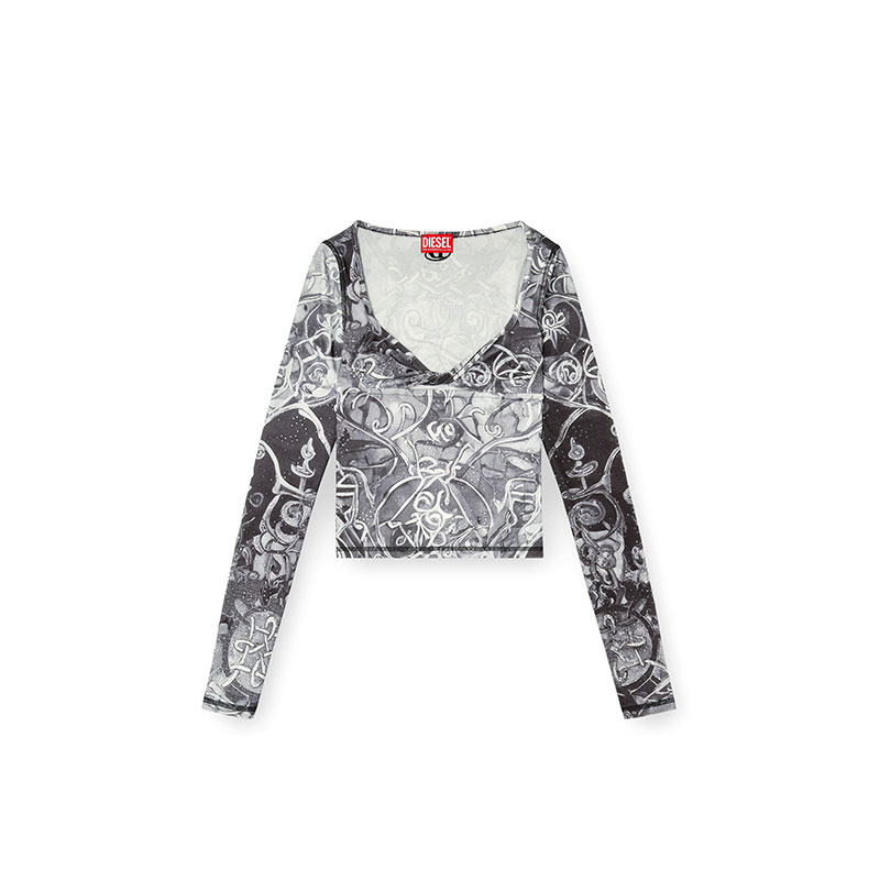 Cut from stretch nylon, this women's sweetheart-neck top is twisted at the front to reveal a hint of skin. The grey print is inspired by Heraldic artwork, showered in see-through crystals for a water droplet effect. Embroidered Oval D on the back.