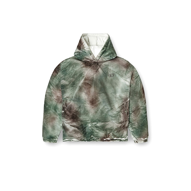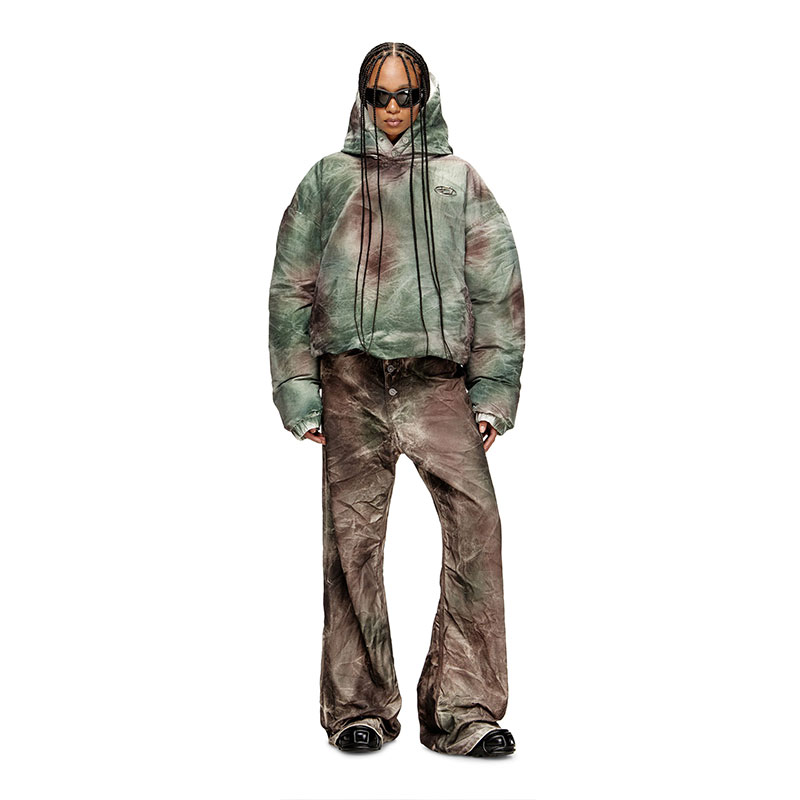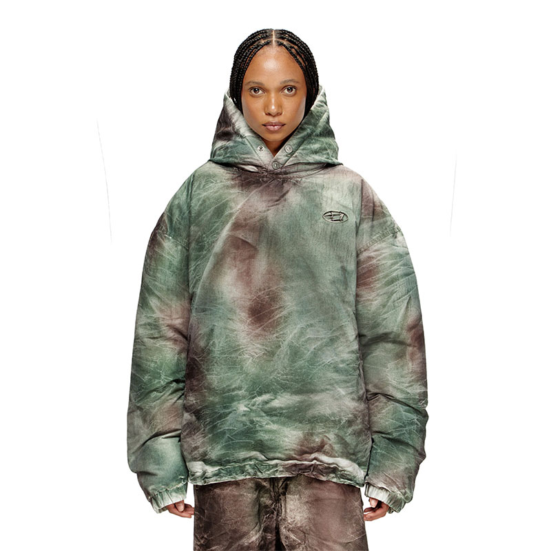 Two distinct underground codes. Singular vision. Diesel and Thug Club — a Seoul-born label with global reach, steeped in streetwear, hip-hop, biker grit and subcultural energy — unite in an eight-look capsule exalting freedom, self-expression and nonconformity. This unisex nylon jacket injects a hand-sprayed fade into a grey-and-green abstract pattern. Featuring a drawstring hem and snaps at the hood, the pull-on silhouette is super puffy, its volume engineered with down-like synthetic padding for warmth without weight. The chest bears fused insignias, a bold cipher of the collaboration.