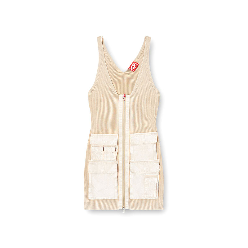 A utility-inflected style, this women's mini dress is fitted with multiple cargo pockets over the front. Made from close-fitting ribbed-knit in organic cotton, it’s garment-dyed and stonewashed for a cool, lived-in fade. The woven fabric pockets and trims absorb the dye differently, resulting in tonal contrast. Note the signature red D logo pull accenting the full-length two-way zip.