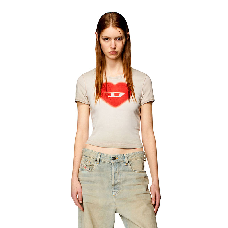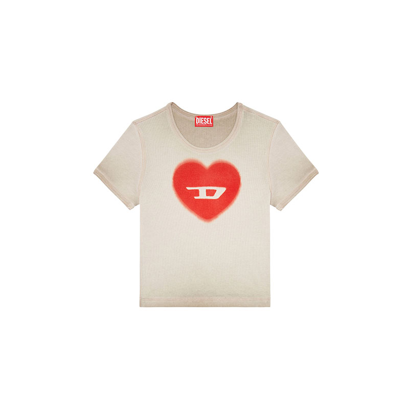 This women's tee is cut from stretch rib cotton that sits close to the body. The D heart logo is printed from the inside to create a watercolour effect. Pigment-dyed whilst inside out for a faded, worn-in look, its skinny silhouette is rounded off with contrast cover-stitching.
