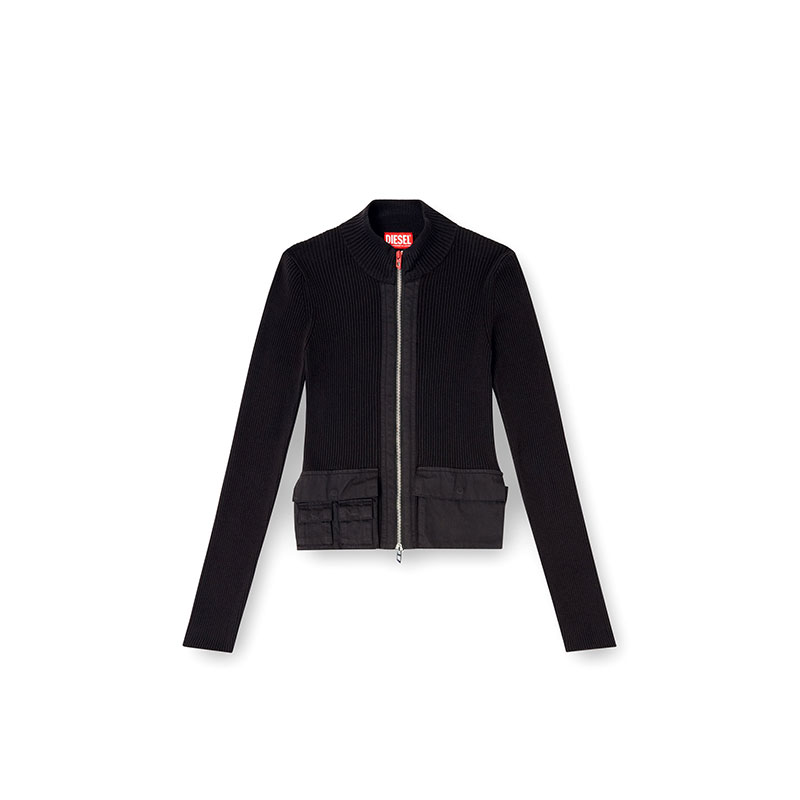 This black women's cardigan with long sleeves and high neck hugs the body in rib-knitted organic cotton. Its slinky silhouette is topped with smooth fabric cargo pockets and opens with a long zip. A red D puller adds a pop of colour.