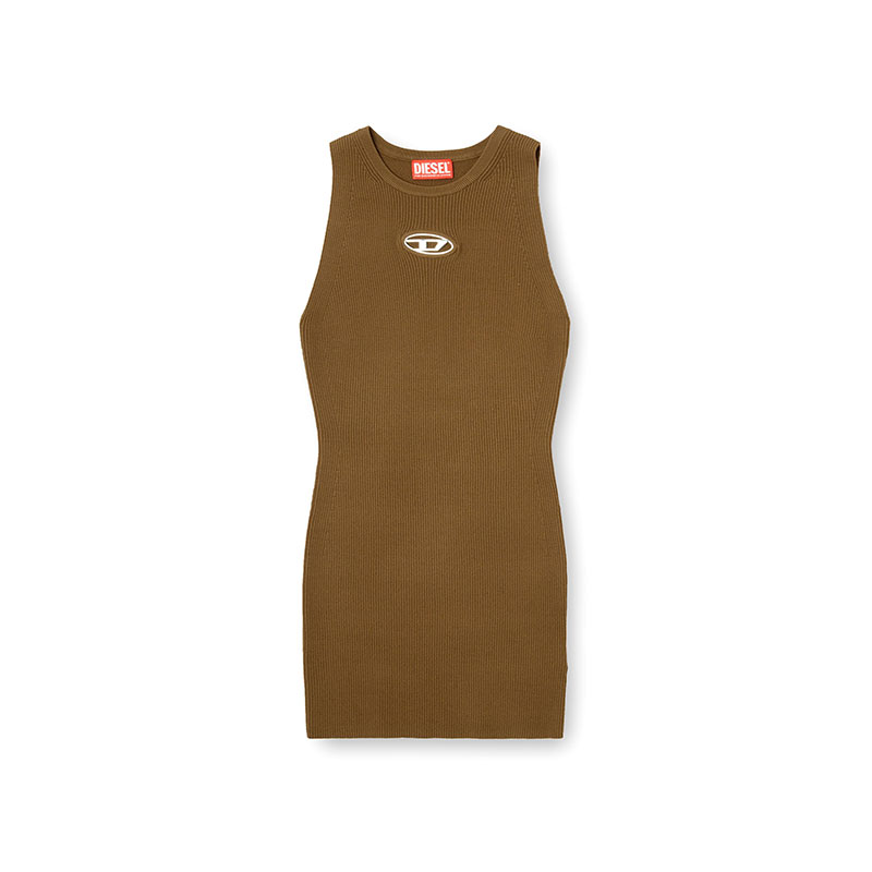 Women's fitted sleeveless dress made from a blend of responsibly sourced viscose. The rib knit features a metallic Oval D at the centre of the chest.