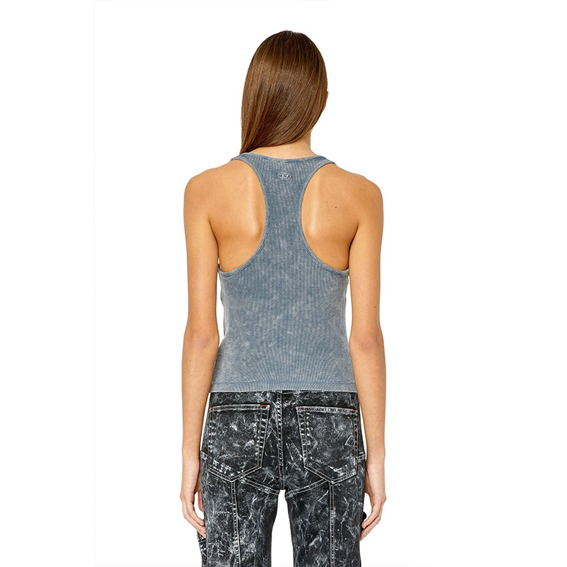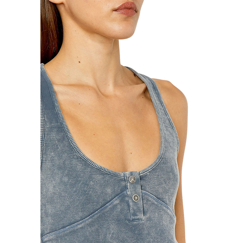 This slim-fit racerback top is cut from ribbed stretch cotton, garment dyed and washed for a faded look. A double snap button Henley opening and embroidered oval 'D' logo on the back complete this women's style.