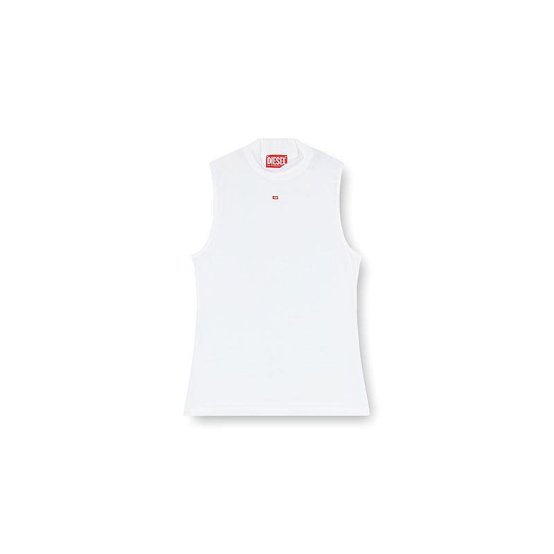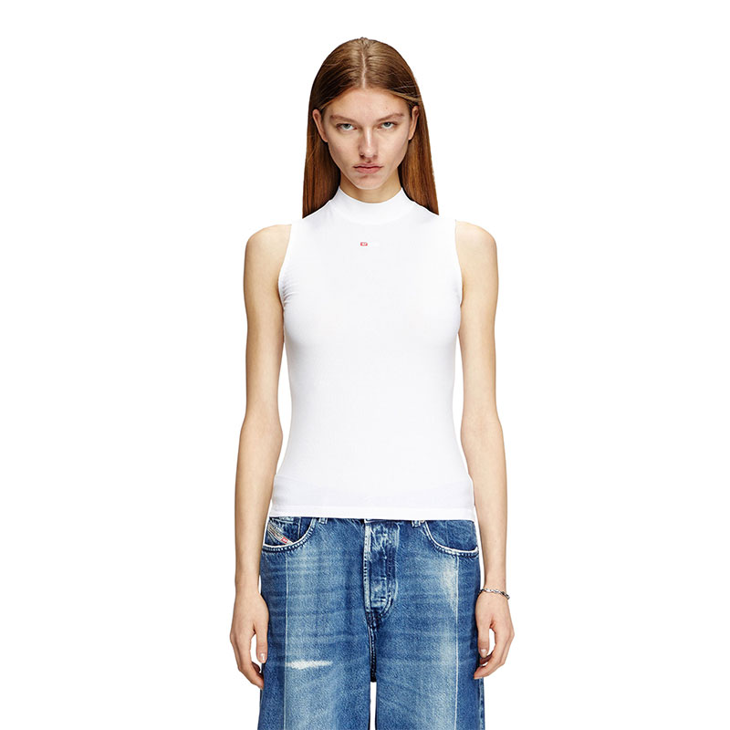 This women's tank top is cut from stretch rib jersey containing Ecovero viscose fibres. Its skinny-fit silhouette flaunts a mock neck and is embroidered with a micro D initial logo on the front.