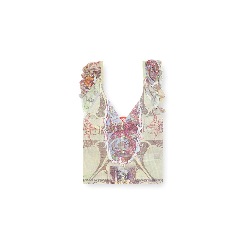 Created in collaboration with an artist, this women’s crop top is a fine ribbed cotton-blend knit printed all-over with medieval-inspired artwork. Trimmed with fluttery ruffles at the shoulder straps, the silhouette features a V-neck and buttons down the front.