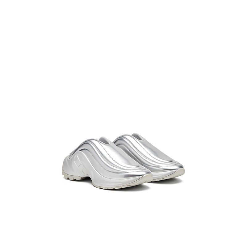 A mule iteration of the S-D-RUNNER-X sneaker, these genderless shoes combine a sculptural silhouette with a futuristic shine of metallic silver. The curve of the soft, slip-on upper is echoed in the meticulous stitching, complemented by an exaggerated sole that’s embossed with a folded-effect Oval D logo.
