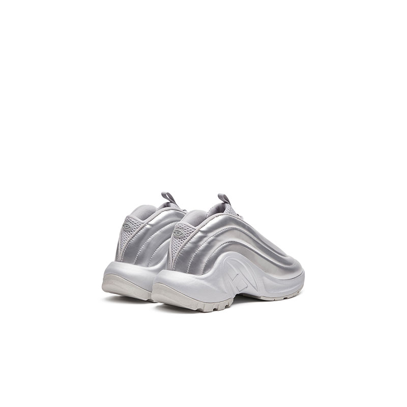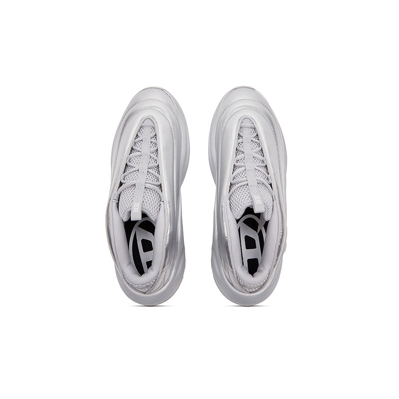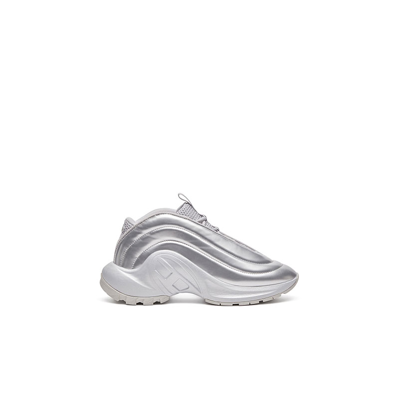Designed for all genders, this shiny ridged trainer flaunts a statement arched silhouette. Its slip-on design features a mesh tongue insert with elasticated cross-cross laces. Set on a rubber running sole with an Oval D wrapping around the instep.