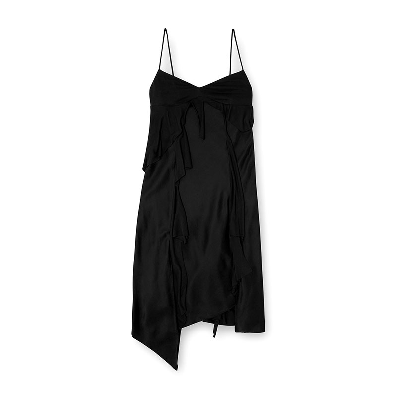 This black satin midi dress is built with raw-cut jersey flounces for a tattered take on a fluid slip style. Its slim, asymmetrical silhouette features a metal Oval D plaque hanging down from the right spaghetti strap.