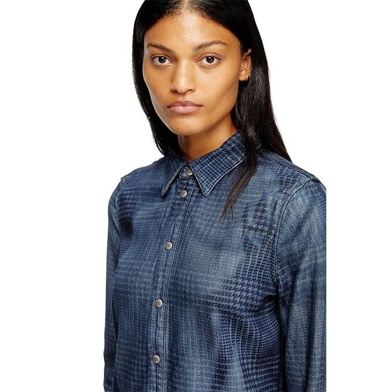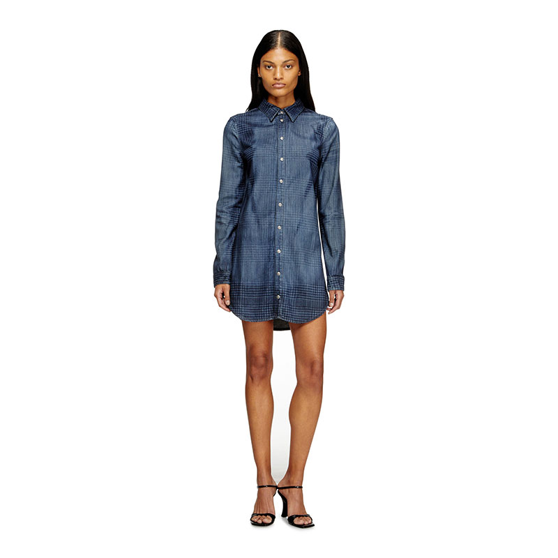 This women's knee-length dress is cut to a sleek shirt silhouette, with a pointed collar and branded metal buttons.Crafted from organic cotton and TENCEL Lyocell for a fluid feel, this medium blue fix denim nods to traditional tailoring, while keeping true to Diesel's DNA. A subtle Prince of Wales pattern is meticulously traced onto the fabric using multiple laser passes, while whiskering and stonewash effects underpin the iconic jeans aesthetic.