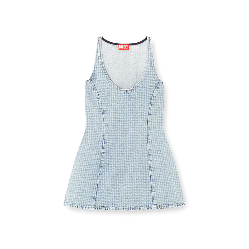 Crafted from fix denim, this light blue wash is laser-printed to create a houndstooth pattern. The fabric is stonewashed to bring a distinctive, disruptive touch to the traditional tailoring motif, and enriched with tiny sparkling rhinestones, carefully positioned to highlight the design of the garment.
