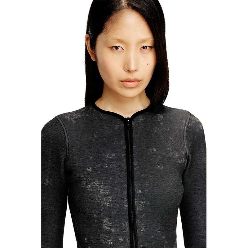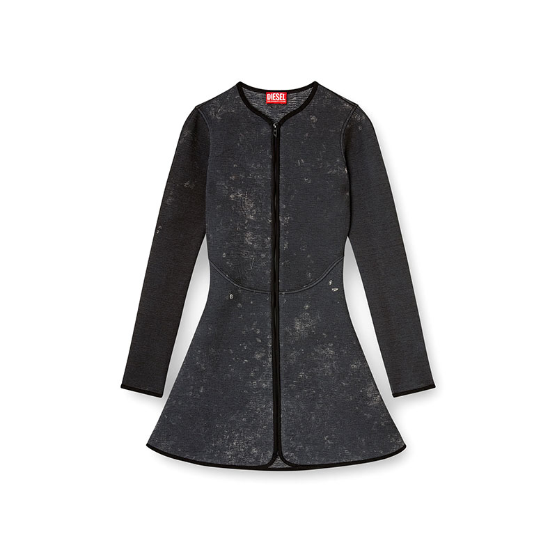 Women’s mini dress in shape-holding scuba made with 82% organic cotton. Treated on the inside for a dégradé marbled fade on the outside, this collarless style hugs the body before flaring into an A-line skirt. The silhouette is outlined with narrow black trims and has a full-length zip. A curved seam at the waist creates the illusion of matching separates.