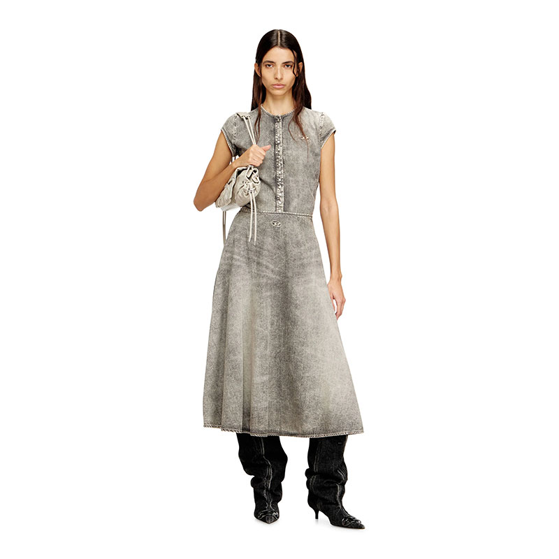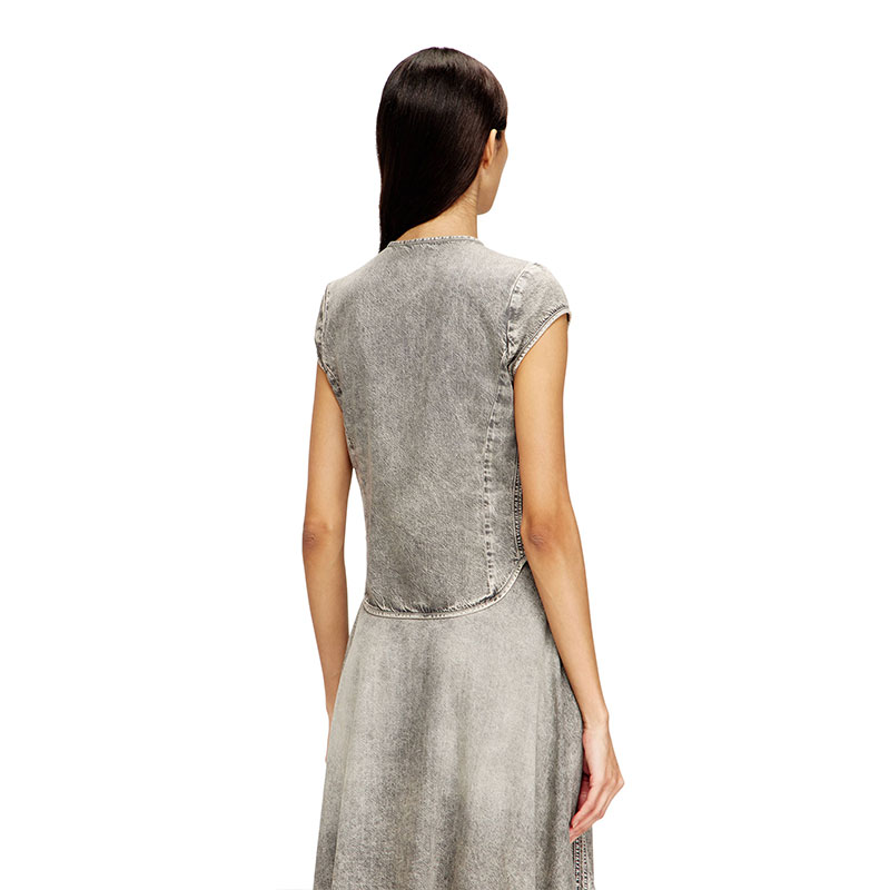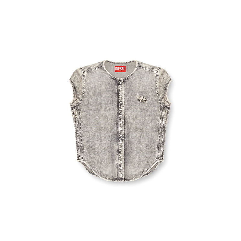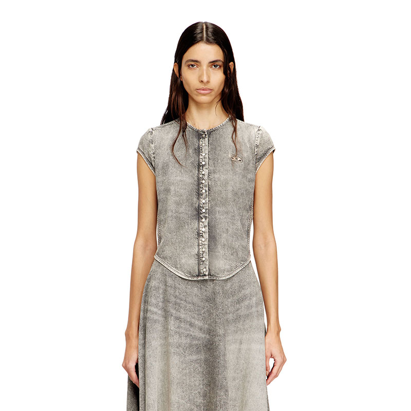 This women's top is designed with a snap-button closure and cap sleeves, minimally detailed with a cut-out and embroidered Oval D on the chest. The grey fix denim is crafted from organic cotton and TENCEL Lyocell for a lightweight, fluid feel. Stonewashed and treated with bleach effects, it features a marbled look and five raised side bands adding add an athletic punch.