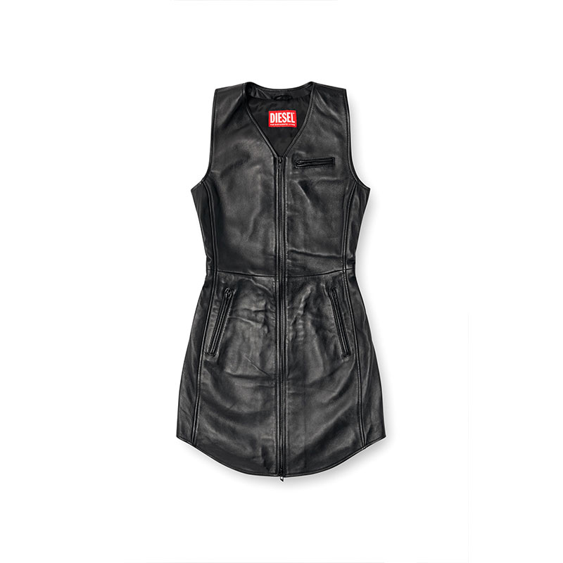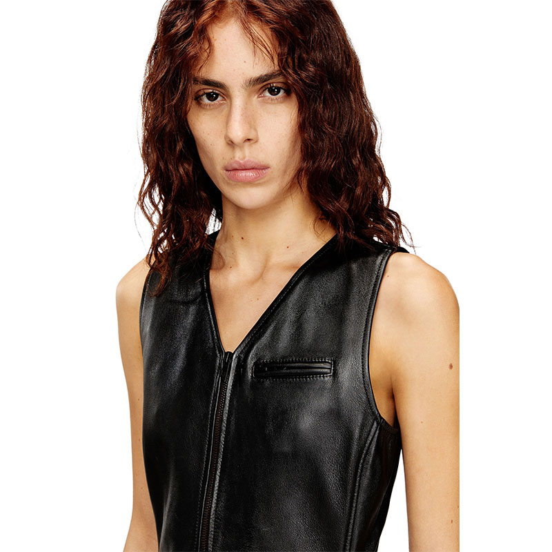 This women's short V-neck dress is made from supple leather that has been sourced responsibly. Designed for a close fit, it has utilitarian zip pockets and a shirt-inspired curved hem. Use the two-way zip to play with the neckline and hem coverage.
