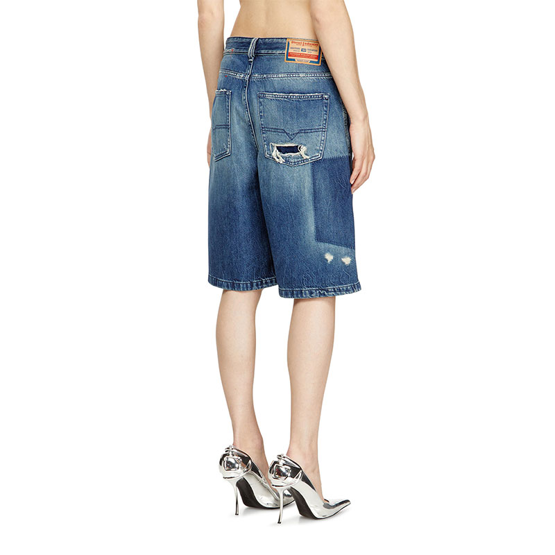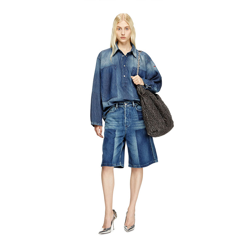 A tribute to Diesel’s experimental attitude, this dark blue fix denim undergoes a unique patch-effect treatment to create daring light and dark motifs. Patches are placed in key areas before sanding, stone washing, and spraying are applied, creating a clear-cut contrast once removed. Final touches like distressing and a used, dirty effect enhance its worn-in character. Made with organic cotton and TENCEL Lyocell for a fluid feel.