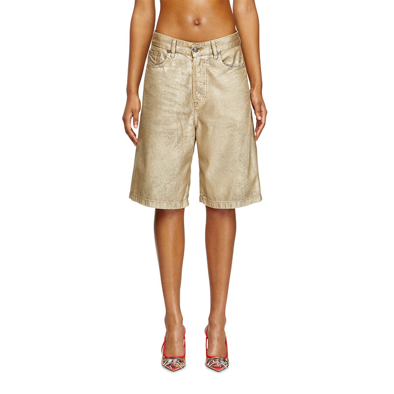 Cut in a loose, knee-length fit, these women’s five-pocket shorts are part of the exclusive Diesel × Karol G capsule. A longtime Diesel fan, the Colombian singer turned global superstar infuses the nine-piece collection — inspired by her chart-topping album Tropicoqueta — with a playful, daring energy. This grey cotton-TENCEL denim is overdyed in sandy tones, coated with shiny gold Mylar foil, and lasered for a signature distressed finish. A bright orange jacron tab at the back hallmarks the collaboration.