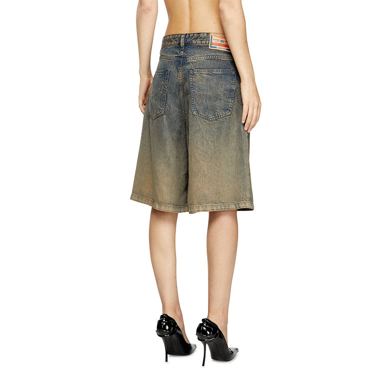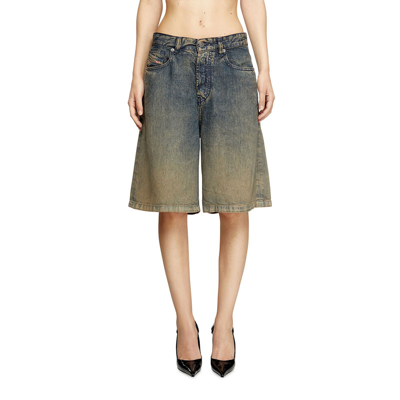 Women's denim five-pocket shorts with a relaxed-leg, knee-length fit. Crafted from lightweight TENCEL Lyocell denim with a fluid texture, it features a blue wash is treated with spray and laser techniques to create a dégradé finish on the hem, enhanced by dirt effects in sandy tones.