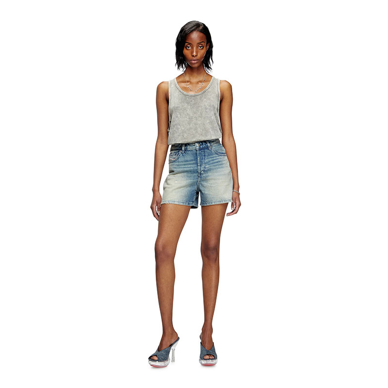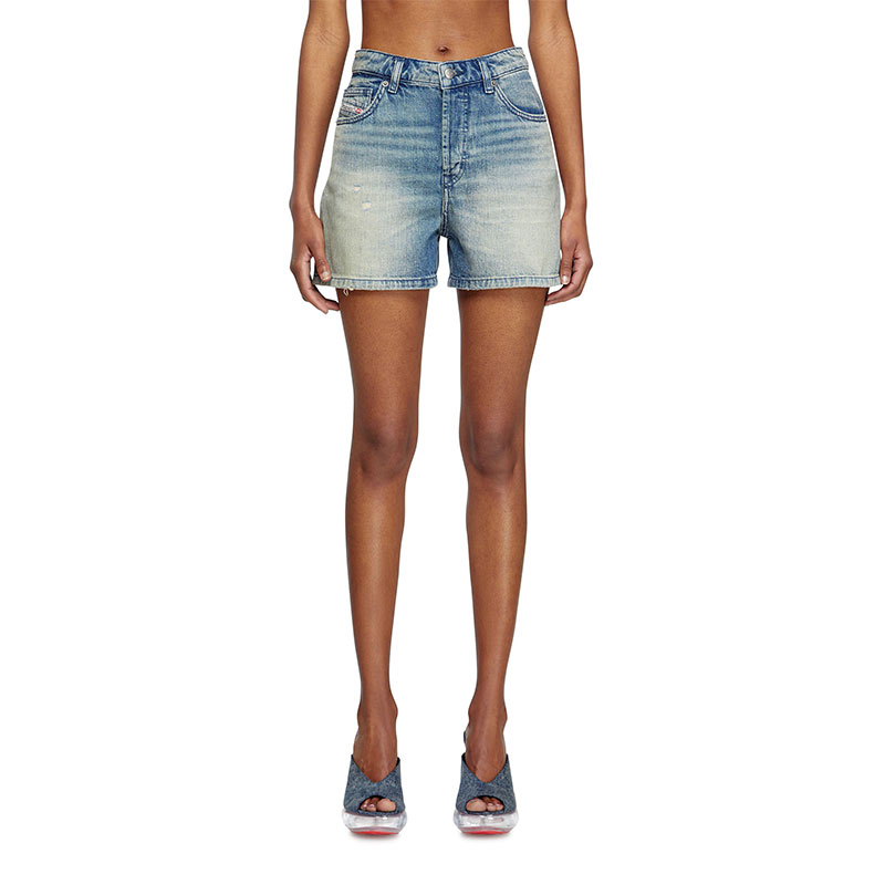 Women's denim five-pocket shorts cut to mid thigh, with a straight fit and medium waist.