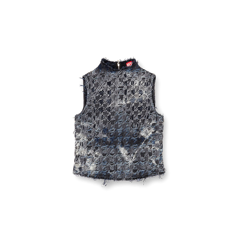Crafted from fix denim, this Runway wash showcases bold light and dark contrasts in a contemporary houndstooth pattern. The fabric is woven using black and blue threads, then treated with bleach and tie-dye techniques to create the motif. Laser and burn effects enhance the worn-in texture and floating threads, making each piece one-of-a-kind – an expression of Diesel’s denim expertise and innovative spirit.