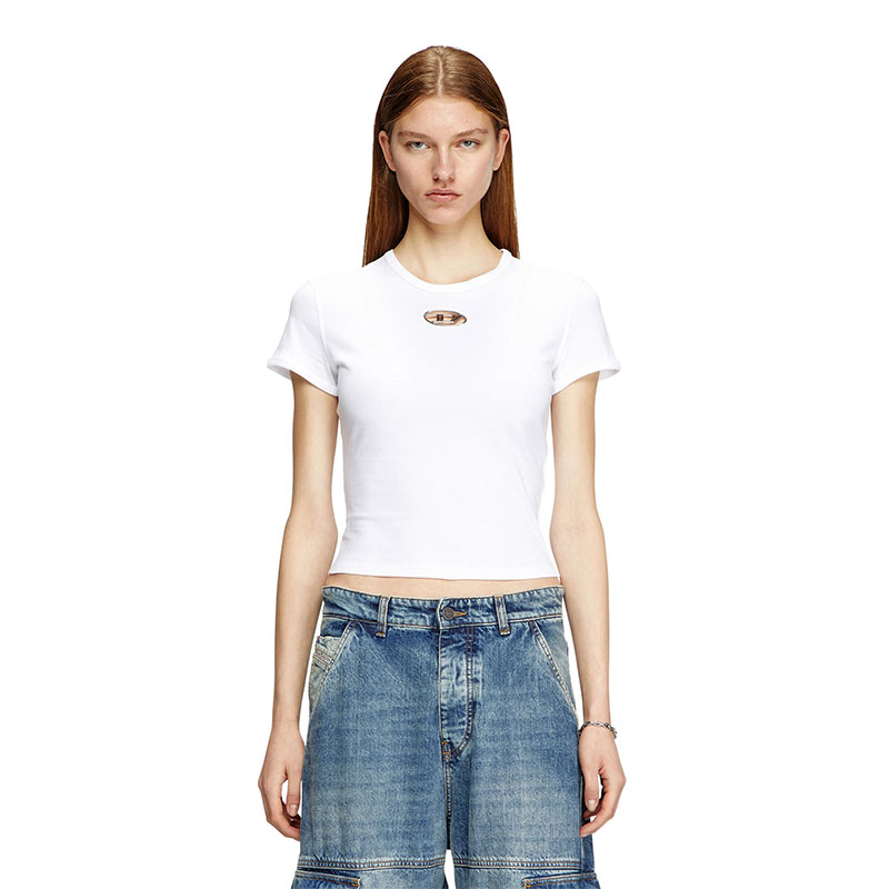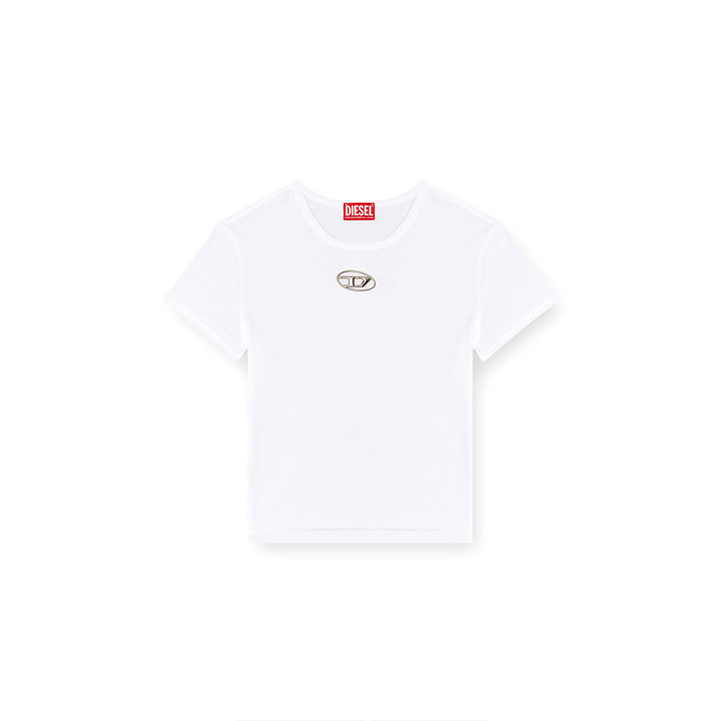 Cut from organic jersey cotton, this women's crew neck T-shirt features a slim silhouette with ribbed trims. The metallic Oval D cut out at the centre of the chest is a signature detail.