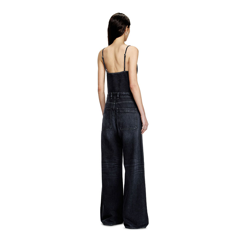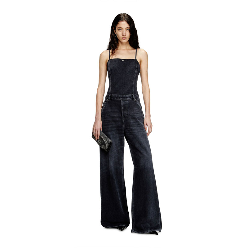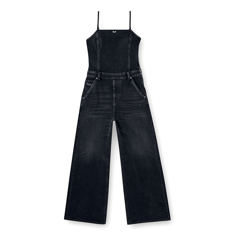 This women’s denim jumpsuit features a fitted, strappy top and a loose fit through the leg. The bottom is detailed with workwear inspired pockets, while a metal D logo plaque hallmarks the chest.
