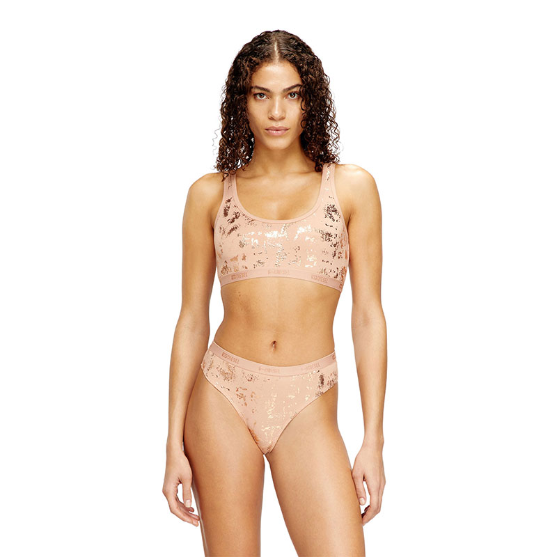 This bralette, crafted from a cotton and elastane blend, features a laminated all-over print that looks intentionally worn and scraped off. The supportive elastic band is adorned with the Diesel logo in the same metallic tones.