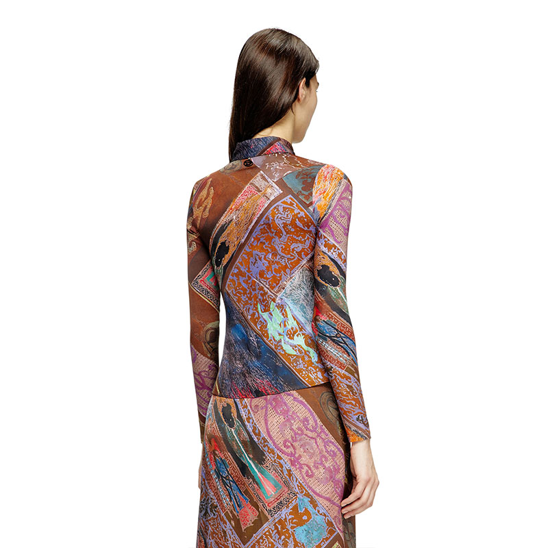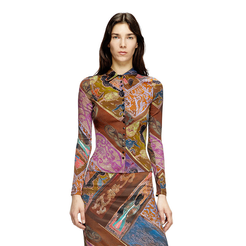 This women’s shirt sculpts the body with a slim silhouette. Cut from soft stretch fabric containing responsibly-sourced viscose fibres, it fastens with snaps and has a metal Oval D charm on the back. The colourful printed artwork is an artistic interpretation of medieval heraldic tiles.