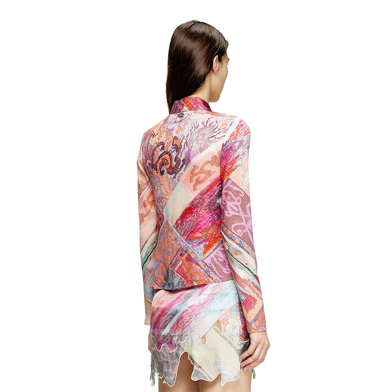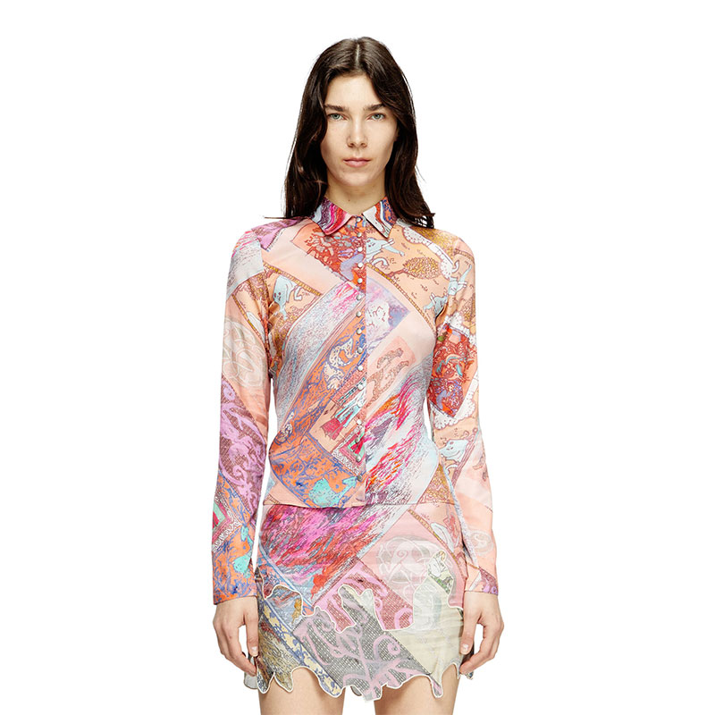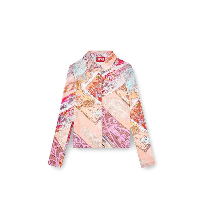 This women’s shirt sculpts the body with a slim silhouette. Cut from soft stretch fabric containing responsibly-sourced viscose fibres, it fastens with snaps and has a metal Oval D charm on the back. The colourful printed artwork is an artistic interpretation of medieval heraldic tiles.