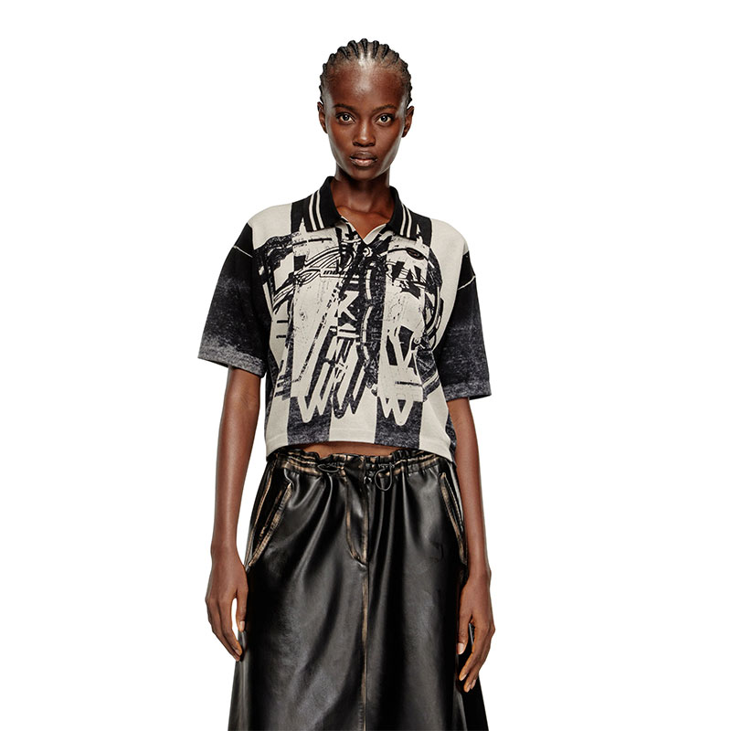 This women's black striped short-sleeve polo jumper riffs off football jerseys. The contemporary 78 logo is printed from the inside for a worn look, topped with Diesel Industry lettering on the outside. Built for a regular fit from organic cotton.