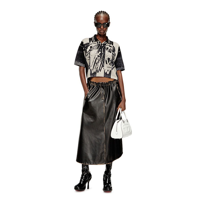 This women's black striped short-sleeve polo jumper riffs off football jerseys. The contemporary 78 logo is printed from the inside for a worn look, topped with Diesel Industry lettering on the outside. Built for a regular fit from organic cotton.