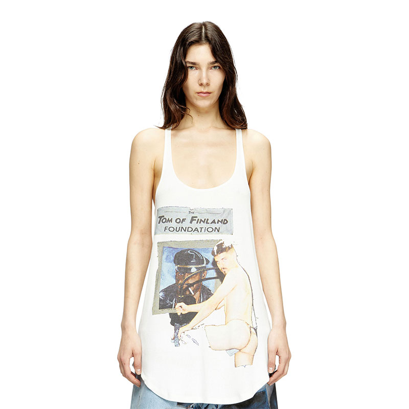 Long tank in lightweight ribbed jersey, cut in a relaxed silhouette with a deep scoop neck and a rounded hemline. Part of a special Pride capsule created in partnership with Tom of Finland Foundation, this genderless top features a printed depiction of artwork selected from the Foundation’s vast collection of queer erotic art, amplifying the importance of self-expression and sexual freedom. Take a closer look at the herringbone tape on the back to see the inspiring message from the Foundation’s legendary namesake artist Tom of Finland.