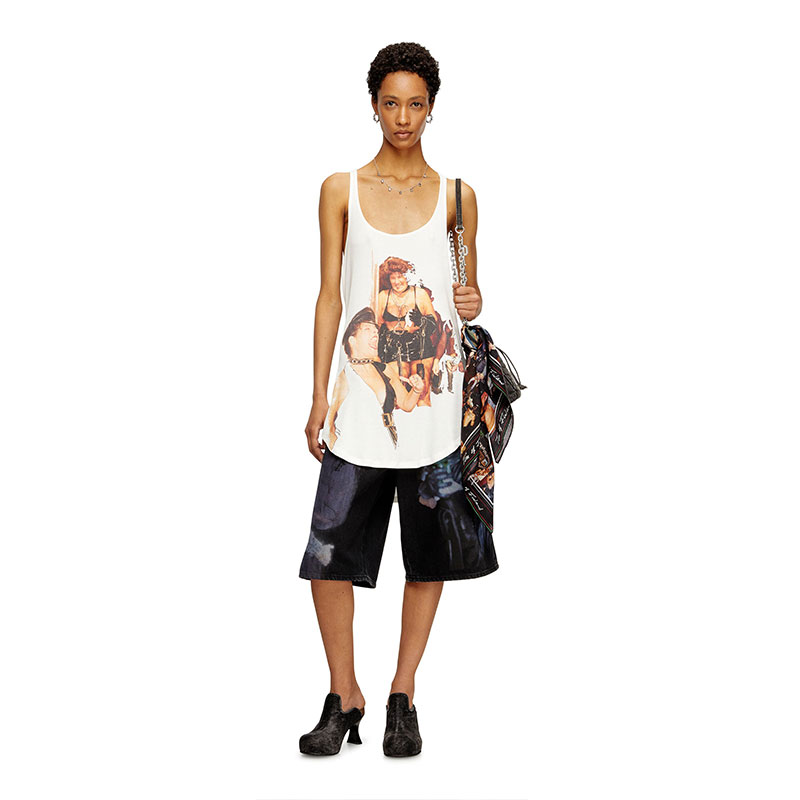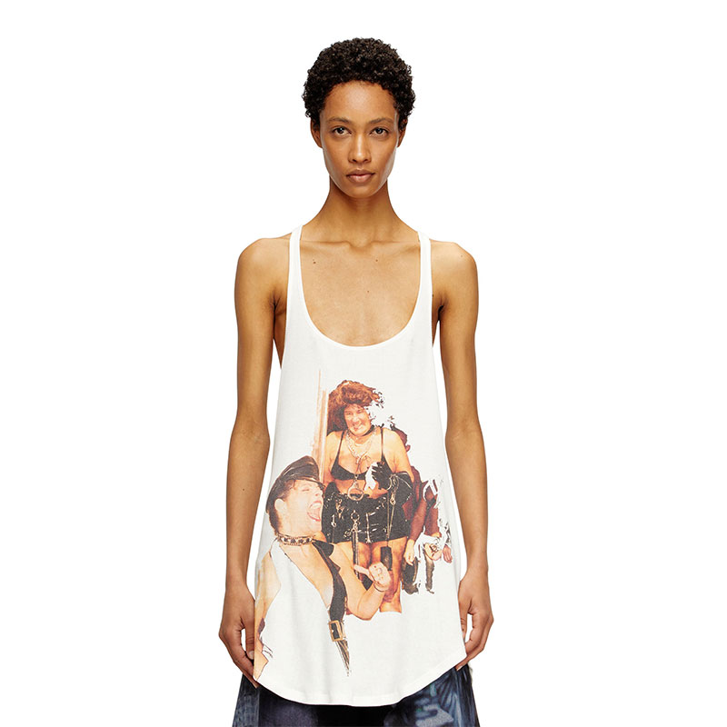 In time for Pride, Diesel once again joins forces with the Tom of Finland Foundation to celebrate the LGBTQIA+ community and reaffirm the importance of freedom of expression and sexuality. Part of the capsule, this long tank top is cut from lightweight ribbed jersey in a relaxed silhouette with a deep scoop neck and rounded hem. A printed depiction of work selected from the foundation's art collection brings this genderless design to life. Take a closer look at the back to spot the herringbone tape featuring a message from Tom of Finland himself.
