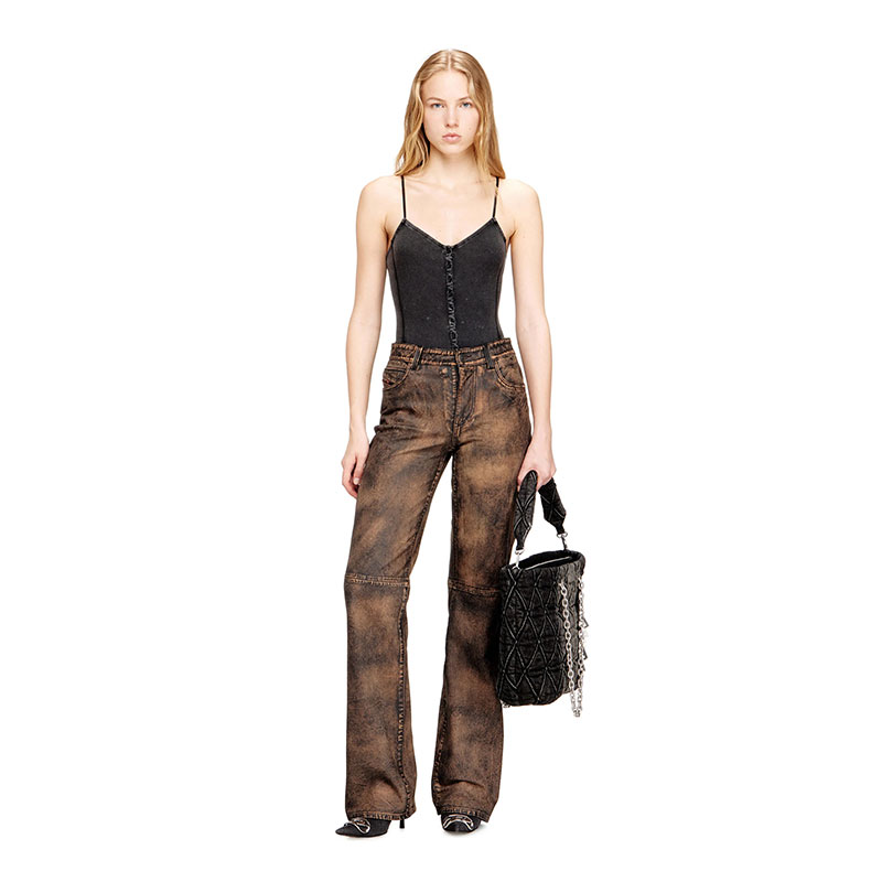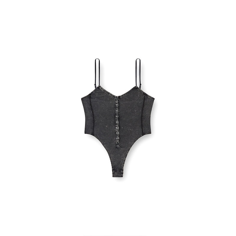 Women’s thong bodysuit in flexible ribbed jersey. Made from a blend of ECOVERO viscose and stretch, this style features adjustable spaghetti straps, buttons at the front and a cool marled fade for a lived-in effect. An embroidered Oval D logo hallmarks the back.