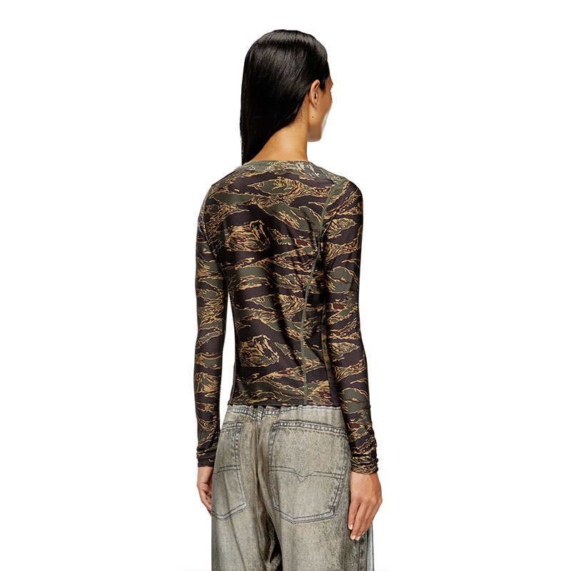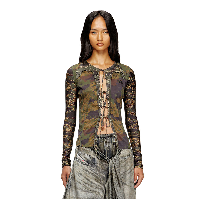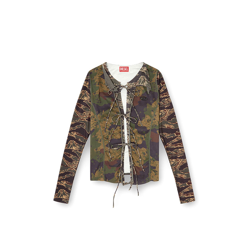 This stretch nylon cardigan is a mash-up of khaki camouflage prints. Its slim, sculpted silhouette is enriched with raw-cut flounces, fastening with delicate ties that reveal a hint of skin. Hallmarked with Oval D embroidery on the chest.