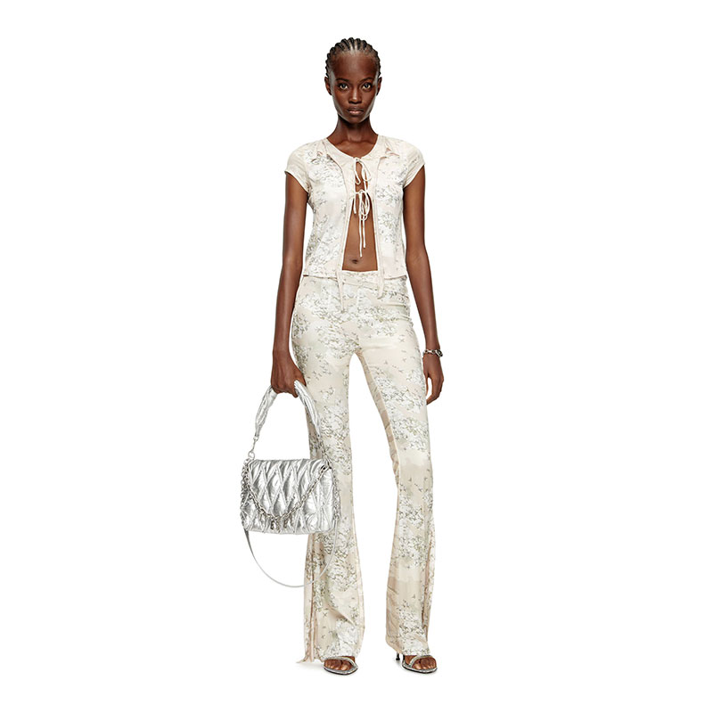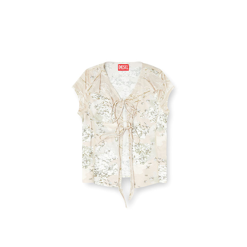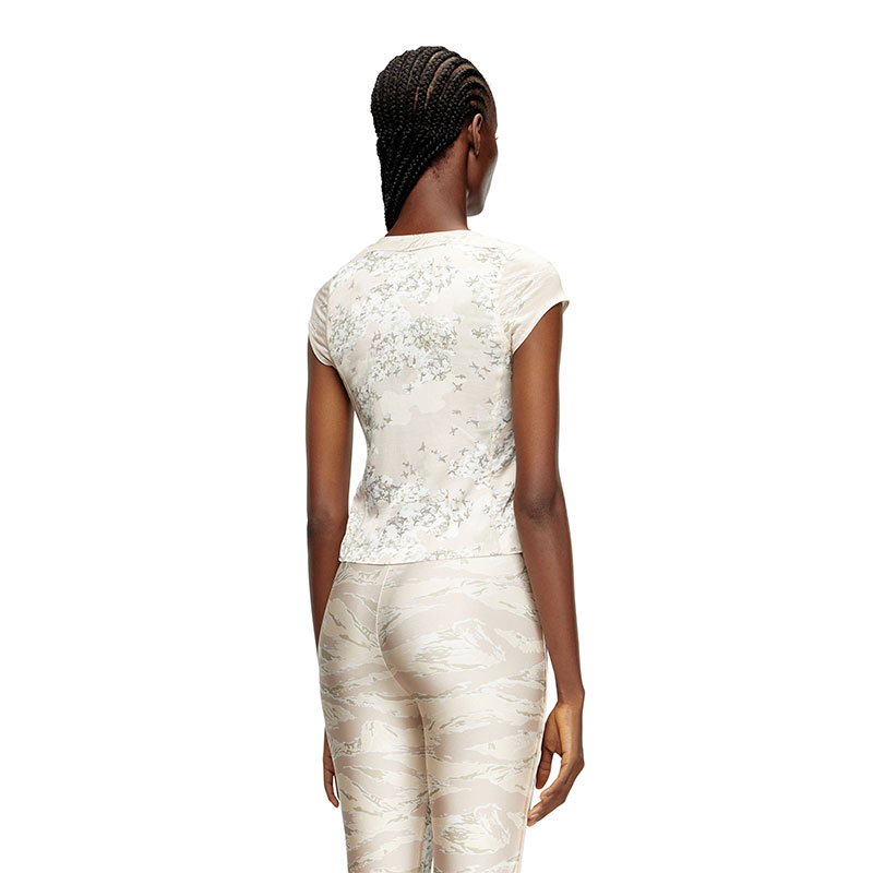 This women's short-sleeve top sculpts the body in stretch nylon, panelled from a mash-up of beige camouflage prints. Raw-cut flounces edge its slim silhouette, fastening with delicate ties that reveal a hint of skin. Hallmarked with Oval D embroidery on the chest.