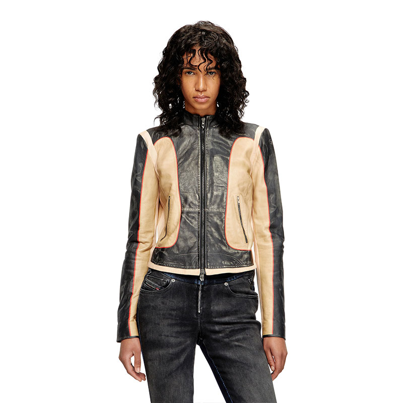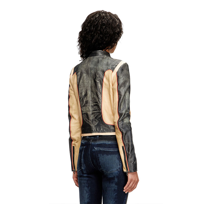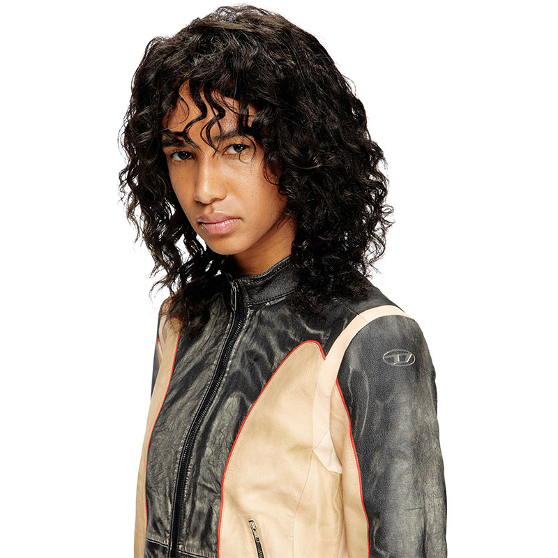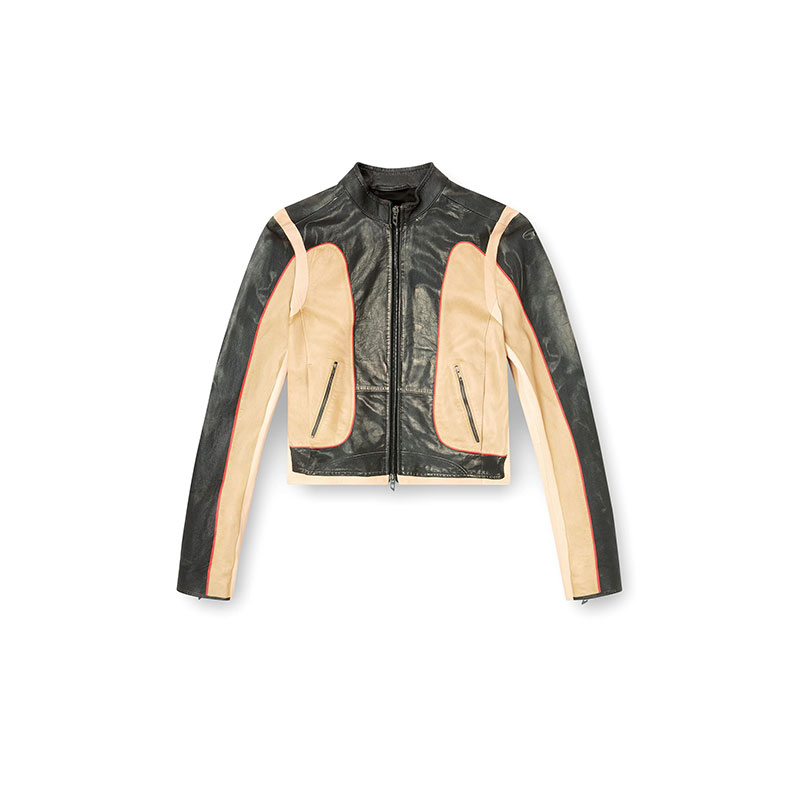The biker jacket gets a meta treatment via trompe l’oeil. Crafted from responsibly sourced vegetable-tanned leather, this women's slim-cut style features a hyper-realistic trompe l'oeil print of an archival '90s moto jacket, with its characteristic colour-block design and piping details. It's fitted with concealed side pockets, meaning the zip-fastening ones are merely an illusion.