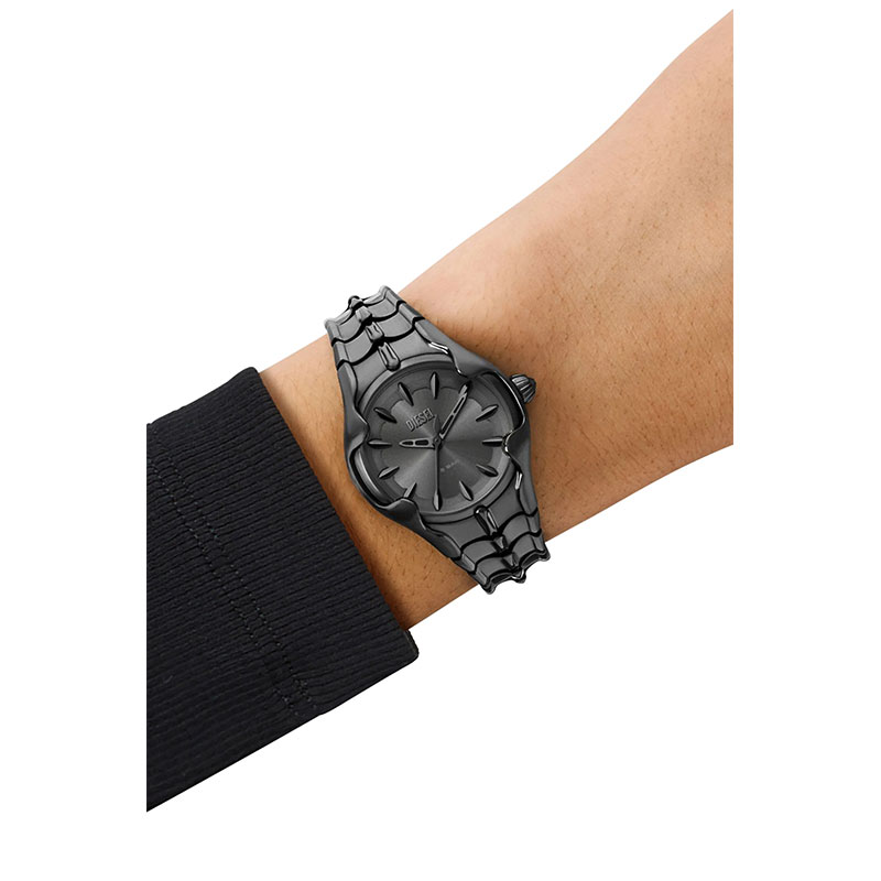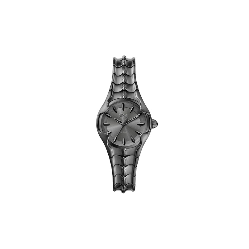 Diesel's 32mm Vert watch features a gray sunray dial, three-hand movement and gunmetal stainless steel bracelet.