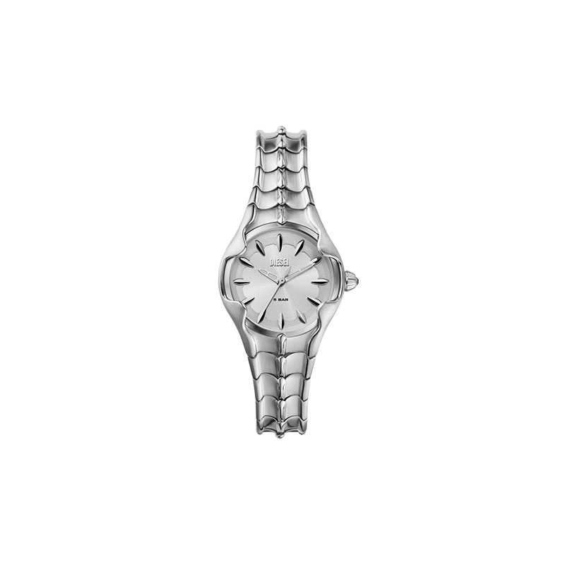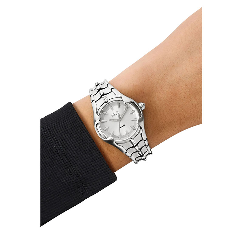 Diesel's 32mm Vert watch features a silver sunray dial, three-hand movement and stainless steel bracelet.