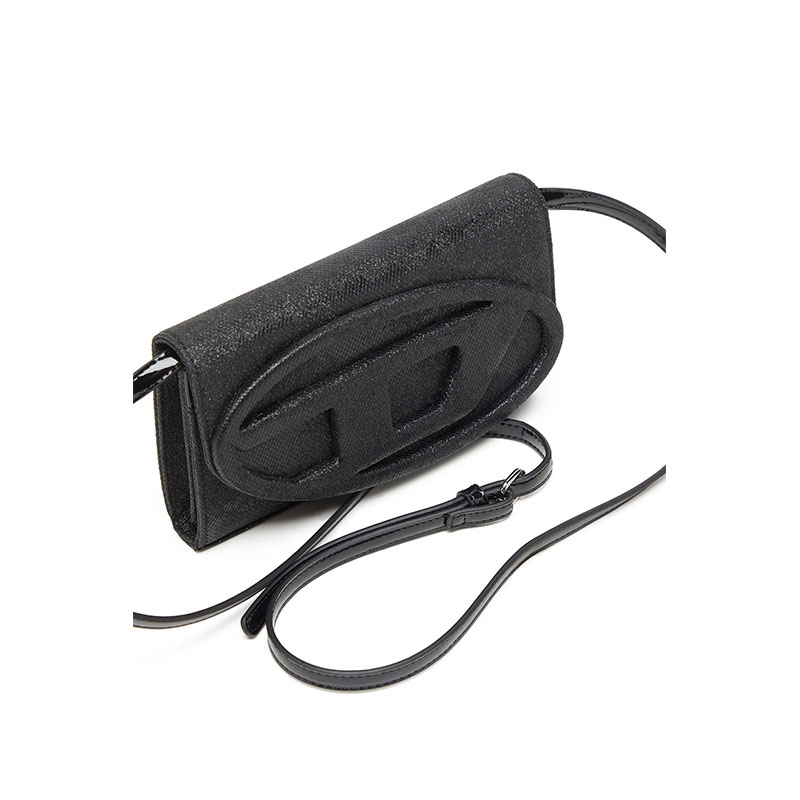 Shine and shimmer mix with subtle utilitarian vibes in this women’s large wallet. Doubling as a clutch or a mini shoulder bag thanks to the optional strap, it’s crafted from black Lurex with a textural-glitter camouflage print and glossy trims. The fabric-covered Oval D plaque seamlessly complements the tonal yet beautifully rich design. The gusseted interior is fitted with card slots, a note compartment and a secure zipped pocket for coins.