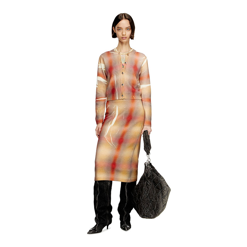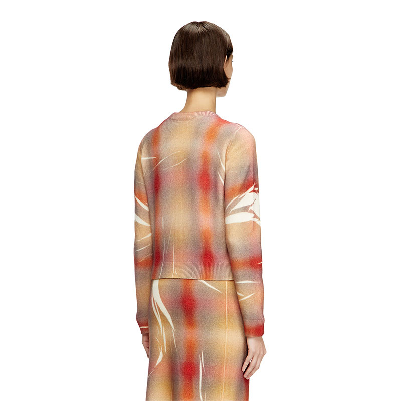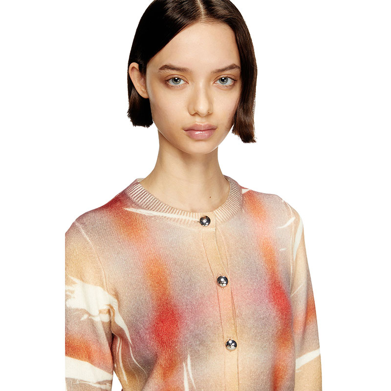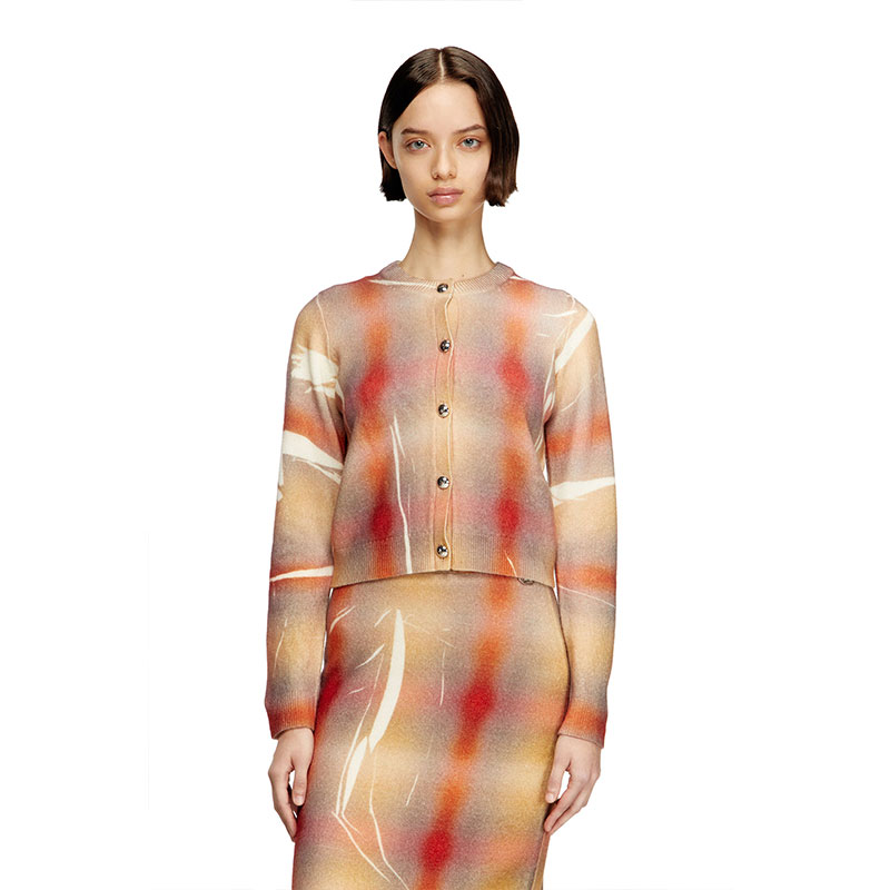 This women’s fine-knit cardigan channels the silhouette of a ladylike jacket. Spun from responsibly sourced wool, it’s printed all-over with a distorted interpretation of checks – that pattern is softly blurred and spliced with streaks of white for a creased effect. Note the prominent silver buttons and neat ribbed trims.