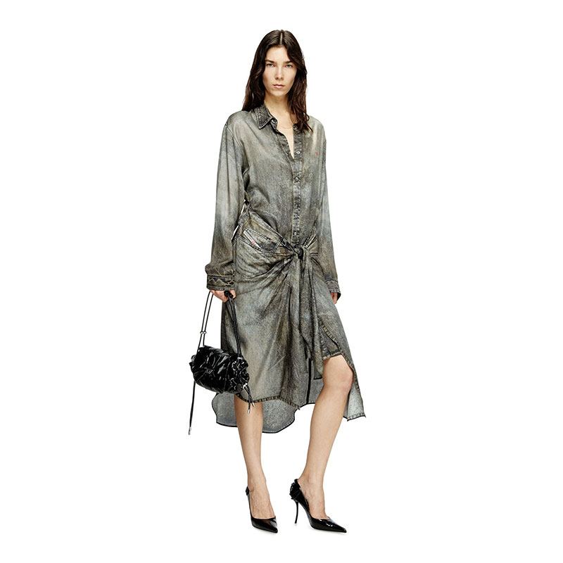 Women's relaxed shirt dress with asymmetrical wrap front. The fluid viscose fabric — made from half responsibly-sourced and half ECOVERO fibres — is printed to look like washed-out black denim, featuring trompe-l'oeil five-pocket detailing.