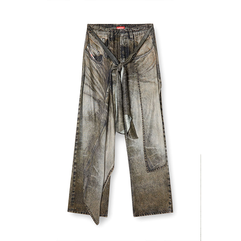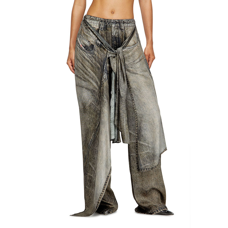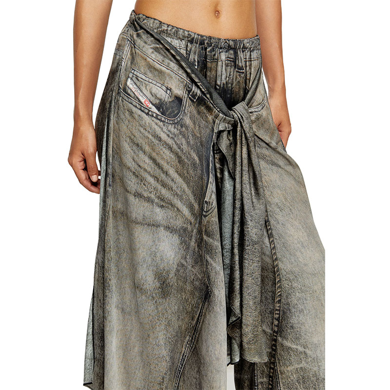This women's pant-skirt hybrid hangs fluidly in viscose fabric, made from half responsibly-sourced and half ECOVERO fibres. The all-over digital print mimics washed-out black denim — note the trompe-l'oeil five-pocket detailing on both the base and tie-front overlay.