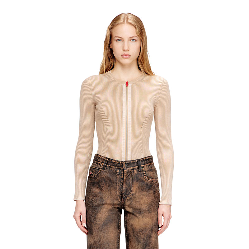 This women’s cardigan blends utilitarian cool with subtle, considered details. Rib-knitted from organic cotton, it has a close-fitting silhouette and a fabric-trimmed zip detailed with a red D logo pull. This garment is made up of both knitted and woven fabrics and dyed post-construction, resulting in tonal variations and lived-in appearance.