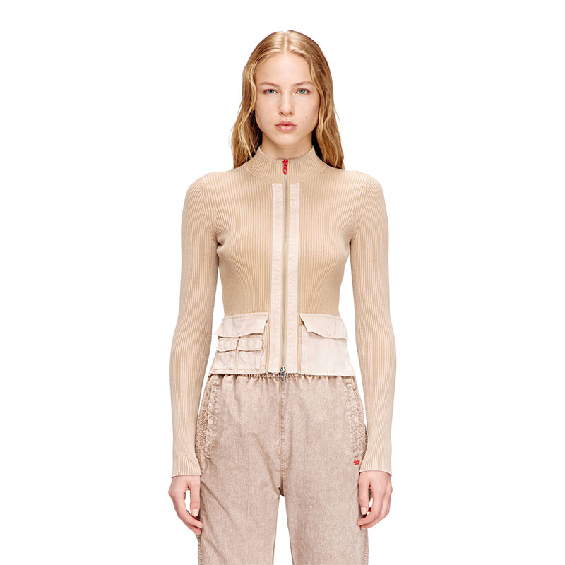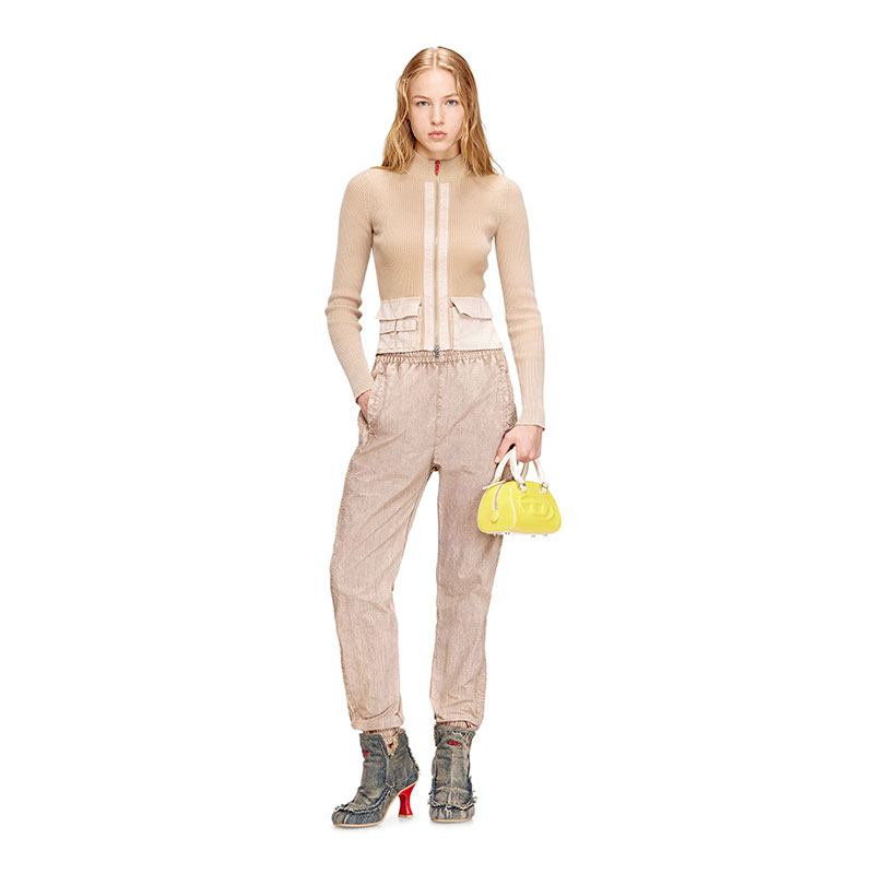 This women's black cardigan plays with saturation and fade. A utility-inflected mock-neck style, it’s rib-knitted from cotton and trimmed with marbled-effect denim – the fabric traces the zip and forms the multi-sized cargo pockets. The red lacquered D logo pull adds a signature touch.