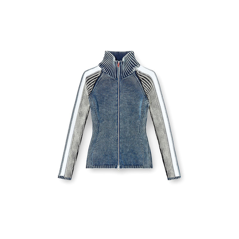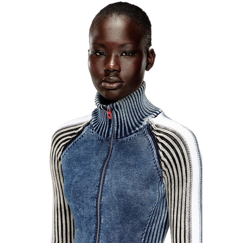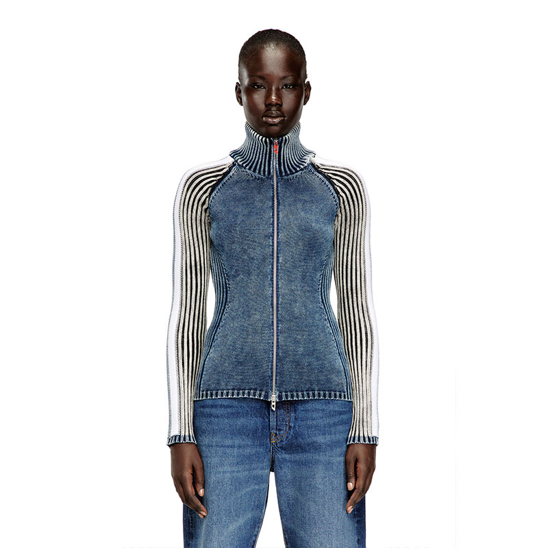 Diesel’s denim DNA and athletic edge, locked in knitwear. This women’s high-neck cardigan is knitted in part from indigo-dyed cotton and treated to echo the fade of denim. Embellished with sporty intarsia bands down the contrasting raglan sleeves, the silhouette is strategically ribbed for texture contrast and a streamlined fit. Note the D-logo pulls at the two-way zip fastening.
