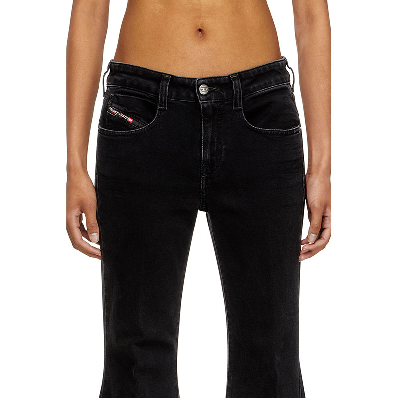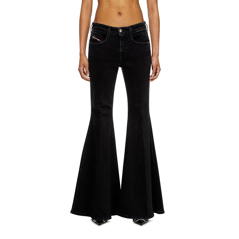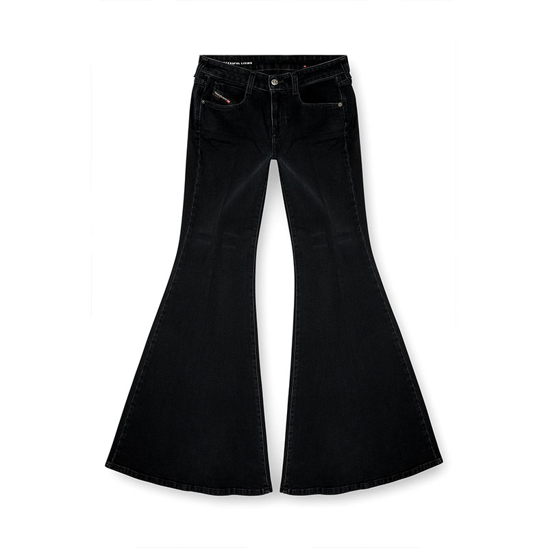 Flared fit with a low waist and streamlined slim leg that widens dramatically from the knee down. A contemporary interpretation of the archival Diesel D-Ferrenz style, defining details of this jean include the inset fifth pocket, thick double belt loops, and iconic Eagle stitching on the back pockets.