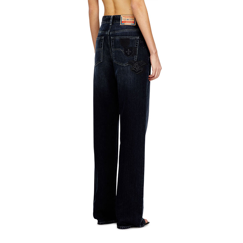Expertly treated, this black fix denim is showcases bold shaded effects and embroidered patches on the front that add an elevated touch.