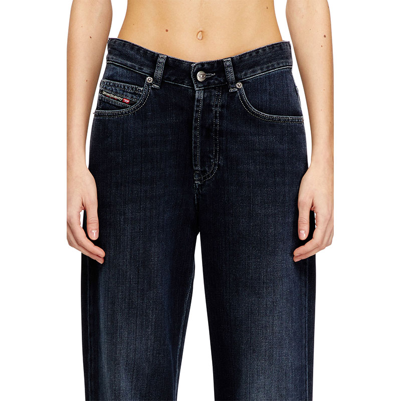 Regular fit with a straight leg. The waistband sits high on the waist and is designed to create a V-shaped front, tracing a feminine yet comfortable silhouette that embodies classic elegance. Fastened with a button fly.