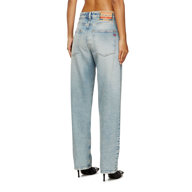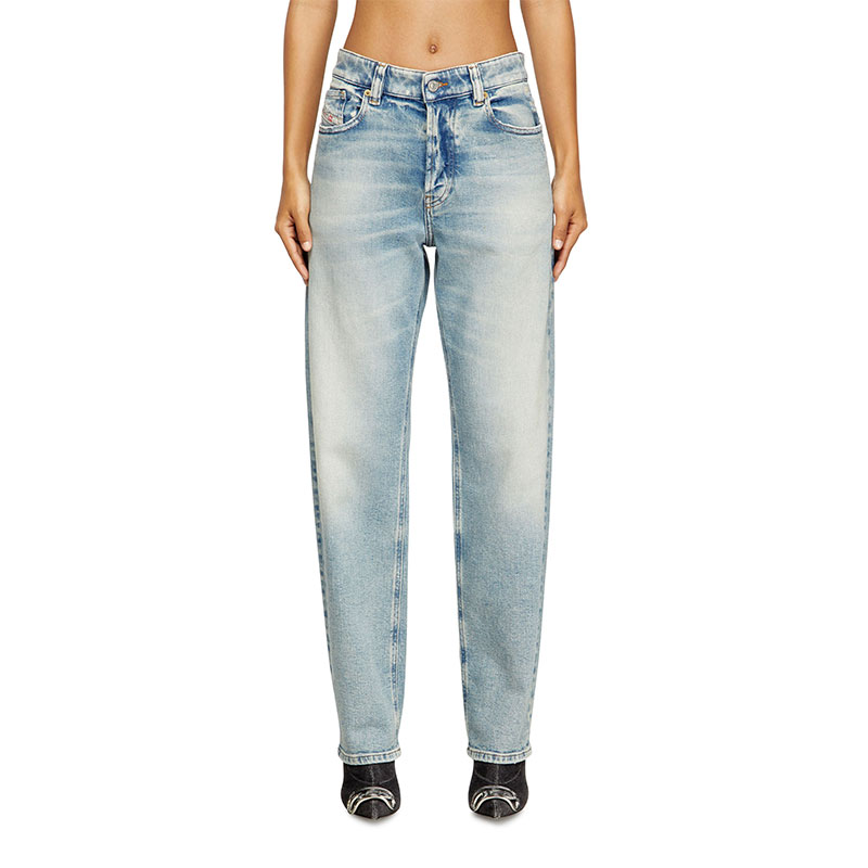 Loose style with a low waist and straight leg. The design is characterised by a cut-off waistband and subtly frayed pockets.
